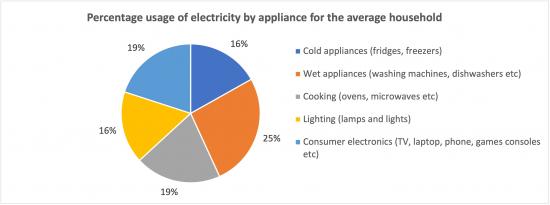 Saving electricity is good for your purse and good for the environment. We all use lots of electrical appliances but do you know which appliances use the most electricity? The Energy Saving Trust now estimate (in January 2021) that washing appliances use the most electricity particularly if you heat your water by electricity and use a tumble drier; but this obviously depends on your household. The piechart below shows that a typical household uses:
