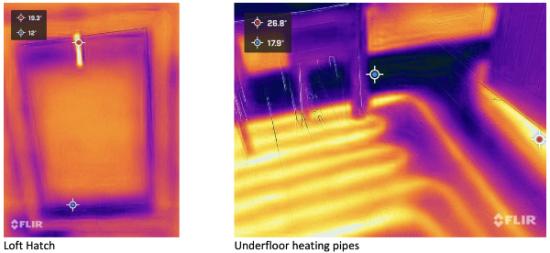 Loft hatches and exterior doors are common sources of cold air. The pictures above were taken with LCG's thermal camera. The colour ranges from blue (cold) to yellow (warm). The temperature of the coldest point around the loft hatch is shown (12 degrees centigrade) and the warmest point (19.3 degrees centigrade). The warmest point is actually the metal catch that holds up the loft hatch and shows hotter because shiny surfaces radiate more heat. Another use of thermal cameras is to identify where hot or cold water pipes run.
