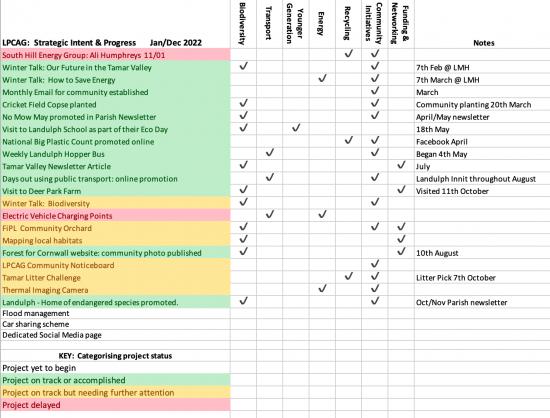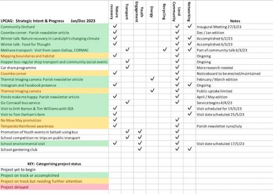 In April 2023, LPCAG reevaluated our priorities for the next year - we all agreed that our priorities of Biodiversity and Transport would continue for another year with Biodiversity renamed to Nature Recovery as this more accurately reflects what we want to achieve. Other topic headings include Energy, Youth Engagement, Local Community and Networking. We will maintain Recycling with a view to prioritising this topic in 2024 to coincide with changes in Cornwall County Council’s waste management services. The chart below illustrates the activities we have completed so far this year against our priorities: