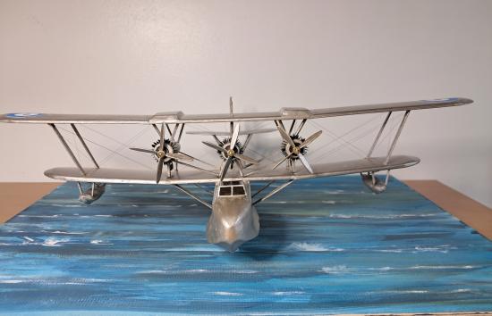 This Rangoon flying boat was a difficult challenge as Glenn had little design information and had to carve the shape of the hull using a few photos from the web.  It worked well and I painted the sea for it to be displayed on.  I had instructions on how rough it needed to be for takeoff or landing and the direction of the wave train.